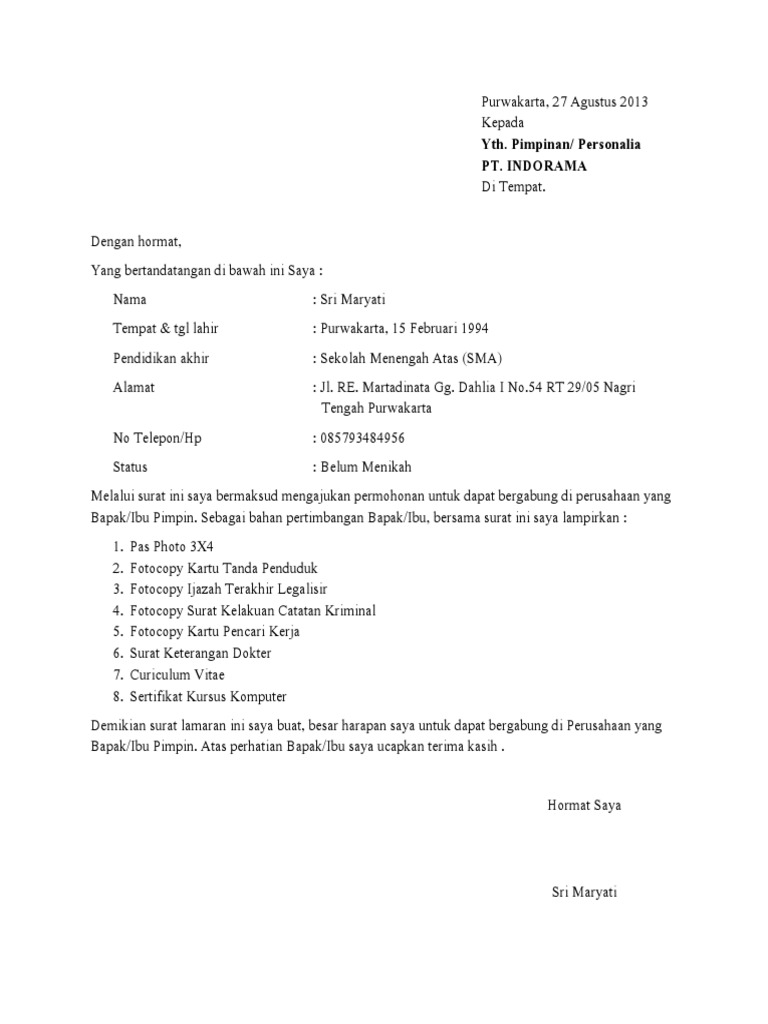 Contoh Surat Lamaran Smk Di Pabrik Indorama / Contoh Surat Ran Kerja Untuk Lulusan Sma Dan Sederajat Www Kurikulum Pendidikan1 Blogspot Com - Jangan khawatir, kali ini 1.. Contoh surat lamaran kerja di alfamart. Contoh surat lamaran kerja di pabrik. Surat lamaran kerja | contoh surat lamaran kerja terbaru, contoh cv menarik, download contoh surat lamaran, lowongan kerja surat lamaran kerja contoh surat lamaran kerja, contoh cv menarik, lowongan kerja, loker cikarang, loker karawang, info loker, lowongan pekerjaan, info lowongan pekerjaan Sama halnya seperti poin di atas, meskipun surat lamaran kerja dikirim lewat email, surat lamaran kerja harus tetap ditulis dengan format yang baik dan benar. Jalan permai indah no.234 jakarta.